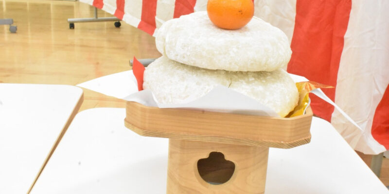 2人で金づちを持って、鏡もちを開きました。ちなみに「割る」という言葉は縁起が悪いと考えられているため、「開く」と言います。