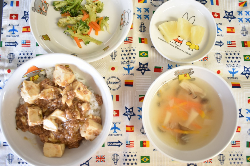 6月12022にじいろ給食ブログ~ 今日の給食 ~ ・マーボー豆腐丼 ・ブロッコリーと人参のごま和え ・春雨スープ ・パイン ~ 今日のおやつ ~ ・牛乳 ・マカロニきな粉 Post navigationPreviousPrevious post:6月1日(水)NextNext post:6月2日(木)