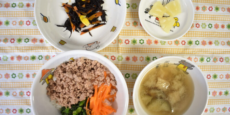 6月282022にじいろ給食ブログ~ 今日の給食 ~ ・三色丼 ・ひじき煮 ・なすと油揚げのみそ汁 ・パイン ~ 今日のおやつ ~ ・牛乳 ・あじさいゼリー ・ミルクスティック(幼稚部) ・ビスケット(保育部) Post navigationPreviousPrevious post:6月27日(月)NextNext post:「ほし組 食具の持ち方練習」