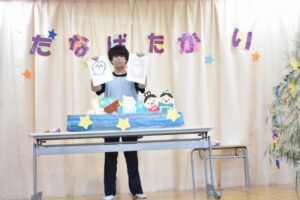本日は七夕集会の様子を 行いました♪ たいようぐみさんが作った笹飾りを飾ってくれました。 子どもたちは目の前で見る大きな笹に、大喜びでした♪ 笹を快く提供していただいた日本化学産業株式会社埼玉工場様 ありがとうございます。 Post navigationPreviousPrevious post:7月4日(月)NextNext post:7月5日(火)