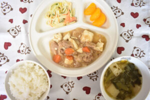10月122022にじいろ給食ブログ~ 今日の給食 ~ ・肉豆腐 ・スパゲティーサラダ ・ごはん ・お麩とほうれん草のみそ汁 ・みかん ~ 今日のおやつ ~ ・牛乳 ・芋もち田楽 Post navigationPreviousPrevious post:10月11日(火)NextNext post:10月13日(木)