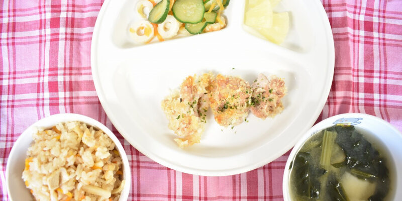 4月102023にじいろ給食ブログ~ 今日の給食 ~ ・鶏肉のパン粉焼き ・ちくわときゅうりの和え物 ・たけのこごはん ・お麩とほうれん草のみそ汁 ・パイン ~ 今日のおやつ ~ ・牛乳 ・ポテトフライ Post navigationPreviousPrevious post:4月10日(月)NextNext post:4月11日(火)