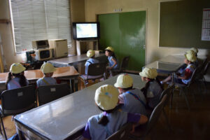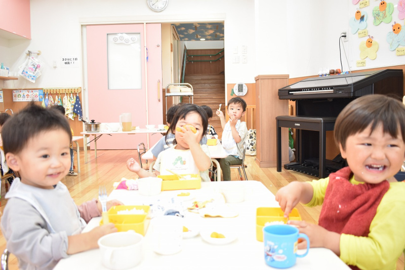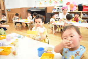 めろん組は給食の唐揚げを美味しそうにペロリしていました。
