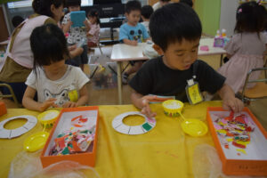 6月142023にじいろブログほし組の制作と室内遊びの様子です。 今日はのりを使った制作をしました。 みんなペタペタと貼っていくのが楽しいようで、夢中になっていました。 その後楽しくおもちゃで遊びました。 お気に入りのおもちゃを先生やお友だちに紹介もしました。 Post navigationPreviousPrevious post:6月13日(火)NextNext post:6月14日(水)