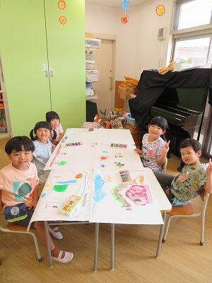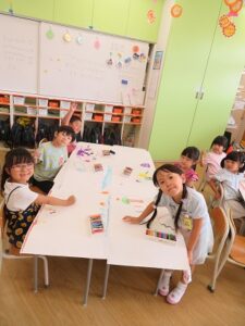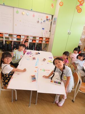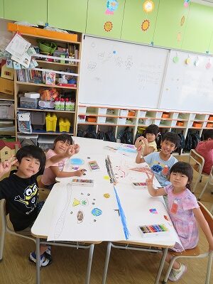 7月252023にじいろブログ本日はたいよう組の様子です☆ 午前中はお水遊びをしました。 ペットボトルを使ってお友達とかけあいながら楽しく遊んでいました。 午後は大きな画用紙にクレヨンで好きな絵を書きました。 みんなとても上手にかけたていたので、楽しみにしていてください。 Post navigationPreviousPrevious post:7月24日(月)NextNext post:7月25日(火)