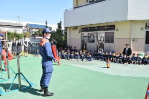 10月182023にじいろブログ 今日は避難訓練を行いました。 消防士さんが立ち合いだったので みんなが上手に避難することが できたか評価を頂きました。 その後は消火訓練です。 先生たちが順番に消火を行いました。 先生たちの頑張りを見て「頑張れ~」 とみんなで応援してくれました。 無事消火訓練も終わり、 最後は消防車の前や中で写真を撮りました。 消防署の方々、お忙しい中 ありがとうございました。 Post navigationPreviousPrevious post:10月18日(水)NextNext post:10月19日(木)