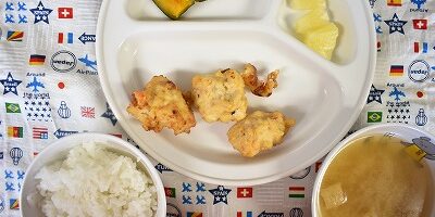 12月12023にじいろ給食ブログ~ 今日の給食 ~ ・鶏ひき肉とツナの落とし揚げ ・かぼちゃの煮つけ ・ごはん ・大根と油揚げのみそ汁 ・パイン ~ 今日のおやつ ~ ・牛乳 ・シュガートースト Post navigationPreviousPrevious post:11月30日(木)NextNext post:12月1日(金)