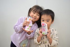 紙コップを使って雪だるまを作りました。個性豊かな可愛い雪だるまができあがりました。