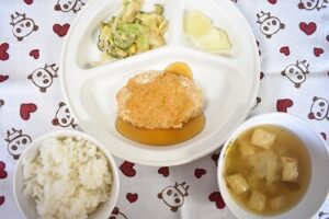 1月222024にじいろ給食ブログ~ 今日のおやつ ~ ・切り干し大根のハンバーグ ・ツナサラダ ・ごはん ・かぶと油揚げのみそ汁 ・パイン ~ 今日のおやつ ~ ・牛乳 ・お好み焼き Post navigationPreviousPrevious post:1月22日(月)NextNext post:1月23日(火)