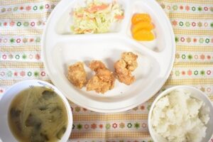 2月152024にじいろ給食ブログ~ 今日の給食 ~ ・鶏の唐揚げ ・コールスローサラダ ・ごはん ・ほうれん草ともやしのみそ汁 ・みかん ~ 今日のおやつ ~ ・牛乳 ・塩せんべい ・ビスケット(保育部) ・クリームサンドビスケット(幼稚部) Post navigationPreviousPrevious post:2月14日(水)NextNext post:2月16日(金)
