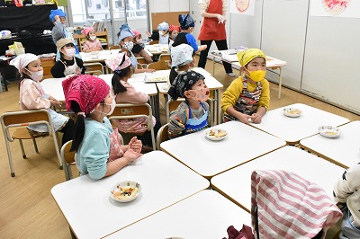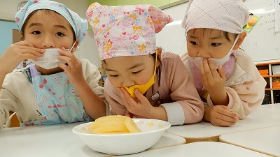 「パイナップル良い匂いがするね」や「じゃがいもはコロコロに切ろう」と楽しく話しをしながら作っていました。