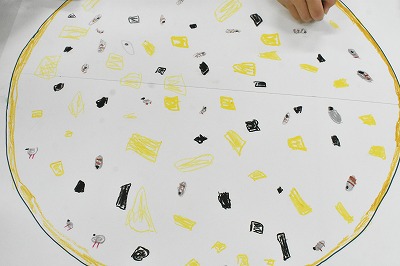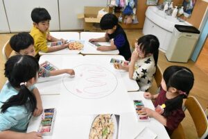 「お肉グループ」・「お魚グループ」・「お菓子グループ」に分かれ、グループごとに具材を考え、絵も描きました。