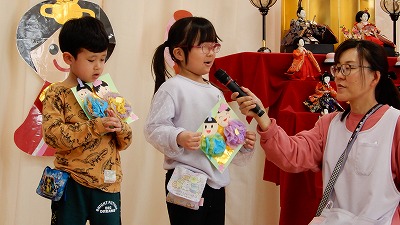 3月12024にじいろブログ本日はひな祭り会の様子です☆ 幼稚部では代表者に自分で作った制作を紹介してもらい、緊張していたけどとても上手に発表してくれました。 先生のクイズにも積極的に答えている姿が見られました。 保育部は先生のお話を真剣な表情で、興味津々に聞いていました。 Post navigationPreviousPrevious post:3月1日(金)NextNext post:3月4日(月)