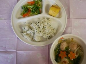 桜はまだあまり咲いていないので延期となりましたが、給食・午後おやつでは「お花見メニュー」を食べました。