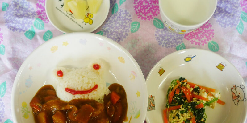 6月172024にじいろ給食ブログ~ 今日の給食 ~ ・ケロケロカレーライス ・ほうれん草の白和え ・牛乳 ・パイン ~ 今日のおやつ ~ <幼稚部> ・牛乳 ・おやつパーティー <保育部> ・麦茶 ・あじさいゼリー ・ビスケット Post navigationPreviousPrevious post:6月17日(月)NextNext post:6月17日(月)「雨の日ランチ・おやつパーティー」