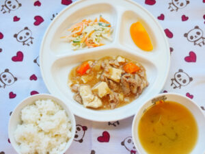 7月222024にじいろ給食ブログ~ 今日の給食 ~ ・肉豆腐 ・切り干し大根のサラダ ・ごはん ・わかめとえのきのみそ汁 ・もも ~ 今日のおやつ ~ ・牛乳 ・とうもろこし(幼稚部・めろん組) ・とうもろこしパンケーキ(いちご・もも組) Post navigationPreviousPrevious post:7月22日(月)「ほし組:とうもろこしの皮むき」NextNext post:7月23日(火)