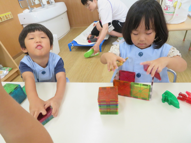 8月92024にじいろブログほし組の室内遊びの様子です。 お人形に「熱がありますね。」「もしもししましょう。」と声を掛け、病院ごっこを楽しんだり、 おともだちと一緒にマグフォーマーで形を作ったりした楽しみました。 Post navigationPreviousPrevious post:8月9日(金)NextNext post:8月13日(火)