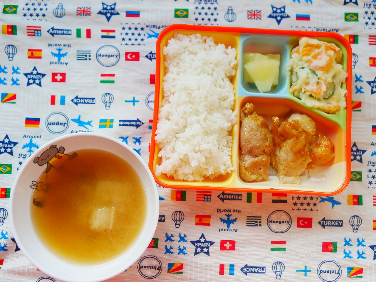 8月152024にじいろ給食ブログ~ 今日の給食 ~ ・タンドリーチキン ・ポテトサラダ ・ごはん ・お麩とわかめのみそ汁 ・パイン お盆期間で人数が少なかったため、幼稚部もお弁当箱に詰めました。 子ども達は、嬉しそうに蓋を開けて食べていました。 ~ 今日のおやつ ~ ・牛乳 ・おひさまゼリー ・甘辛せんべい 丸い形のアセロラゼリーを「おひさまだね」や、「酸っぱいくて甘くておいしい」と楽しく食べていました。 Post navigationPreviousPrevious post:8月15日(木)NextNext post:8月16日(金)