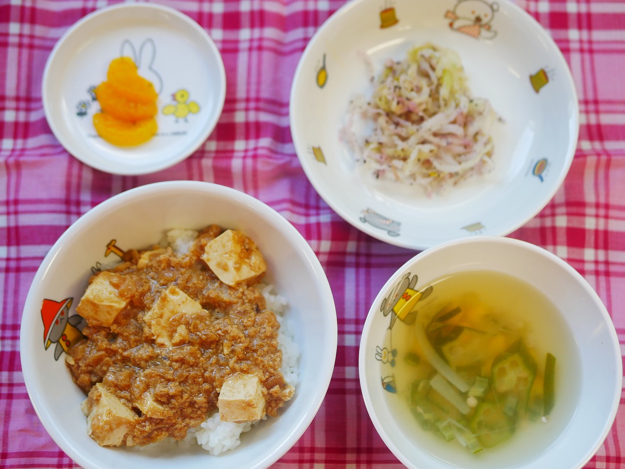 8月262024にじいろ給食ブログ~ 今日の給食 ~ ・マーボー豆腐丼 ・キャベツのゆかり和え ・オクラのスープ ・みかん ~ 今日のおやつ ~ ・麦茶 ・お誕生日ケーキ Post navigationPreviousPrevious post:8月22日(木)NextNext post:8月27日(火)