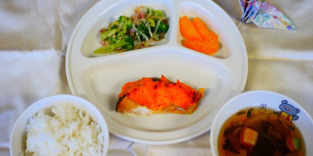 11月82024にじいろ給食ブログ~ 今日の給食 ~ ・鮭のもみじ焼き ・ブロッコリーとハムのサラダ ・ごはん ・てまり麩と野菜のすまし汁 ・みかん ~ 今日のおやつ ~ ・牛乳 ・紅白チュロス Post navigationPreviousPrevious post:11月7日(木)NextNext post:11月8日(金)