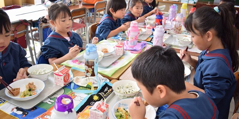 「学校の給食初めて!」ととても喜び、わかめごはんや野菜の和え物をおかわりする子もいました。