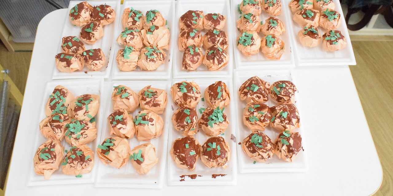 タコ焼きグループでは画用紙を丸め、茶色の絵の具でソースを表現し