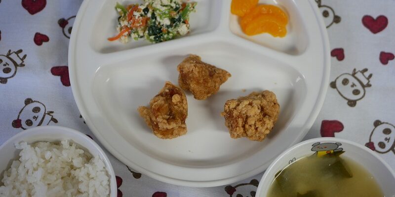 11月252024にじいろ給食ブログ~ 今日の給食 ~ ・鶏の唐揚げ ・ほうれん草の白和え ・ごはん ・じゃがいもと玉ねぎのみそ汁 ・みかん ~ 今日のおやつ ~ ・麦茶 ・お誕生日ケーキ Post navigationPreviousPrevious post:11月22日(金)NextNext post:11月25日(月)