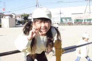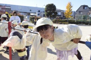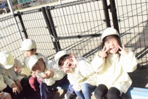 午前は幼稚部みんなでふれあい公園に行って遊具や砂場で遊びました。