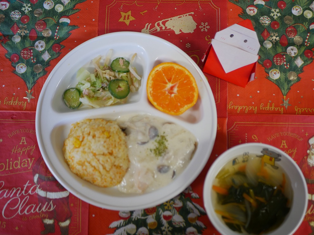 12月252024にじいろ給食ブログ~ 今日の給食 ~ ・クリームチキン ・コーンピラフ ・ツナサラダ ・野菜スープ ・みかん ~ 今日のおやつ ~ ・りんごジュース ・クリスマスパフェ Post navigationPreviousPrevious post:12月25日(水)NextNext post:12月26日(木)