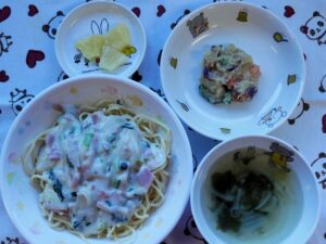 1月142025にじいろ給食ブログ~ 今日の給食 ~ ・クリームサンドスパゲティー ・さつまいものサラダ ・わかめスープ ・パイン ~ 今日のおやつ ~ ・牛乳 ・おかかおにぎり Post navigationPreviousPrevious post:1月10日(金)「幼稚部 鏡開き」NextNext post:1月14日(火)
