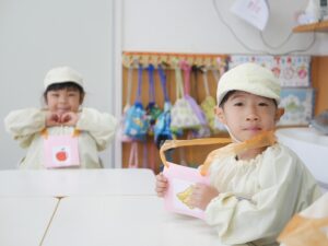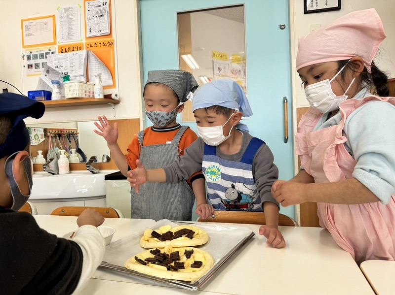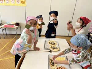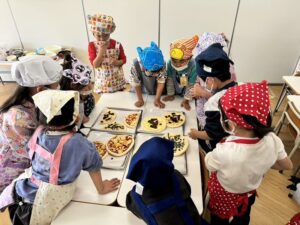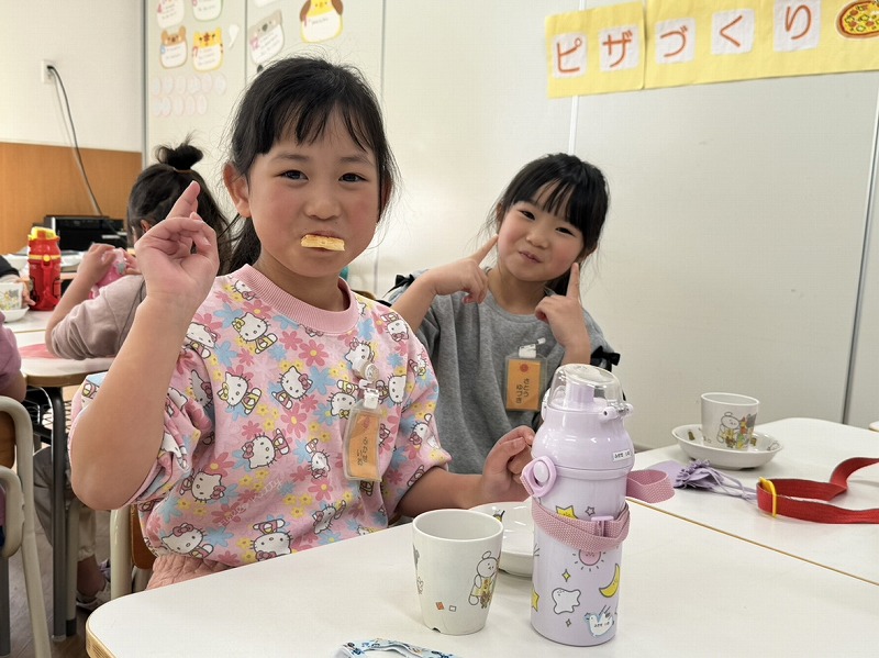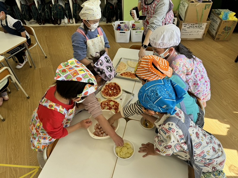 終始笑顔で、お迎えの際には保護者の方に楽しそうにピザづくりの事を伝えていました。