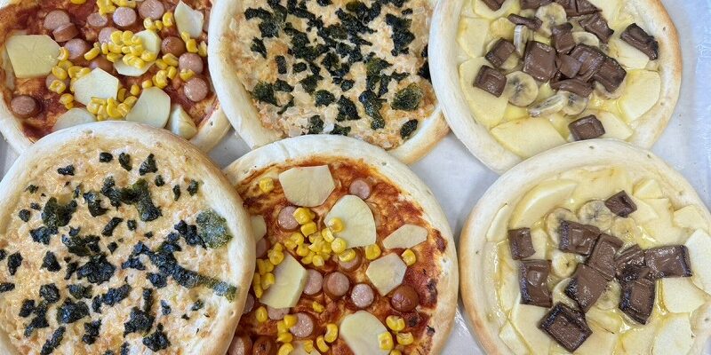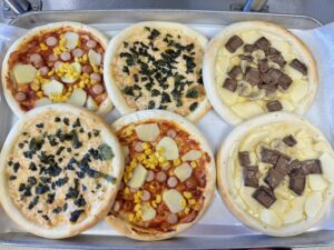 具材の準備ができたら、ピザ生地にそれぞれソースやクリームをかけトッピングしました。