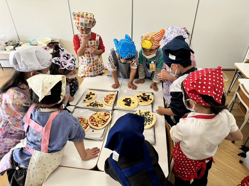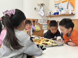 出来たピザを見て、子ども達は「すごい」や「おいしそう」と目をキラキラ輝かせていました。
