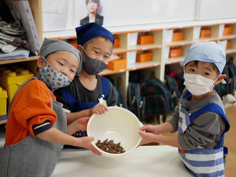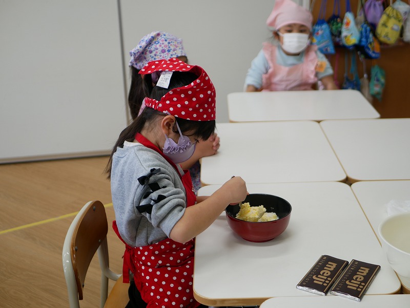 園に戻ってきてからは、チョコをてで割ったり、包丁で野菜や果物を切ったりしました。