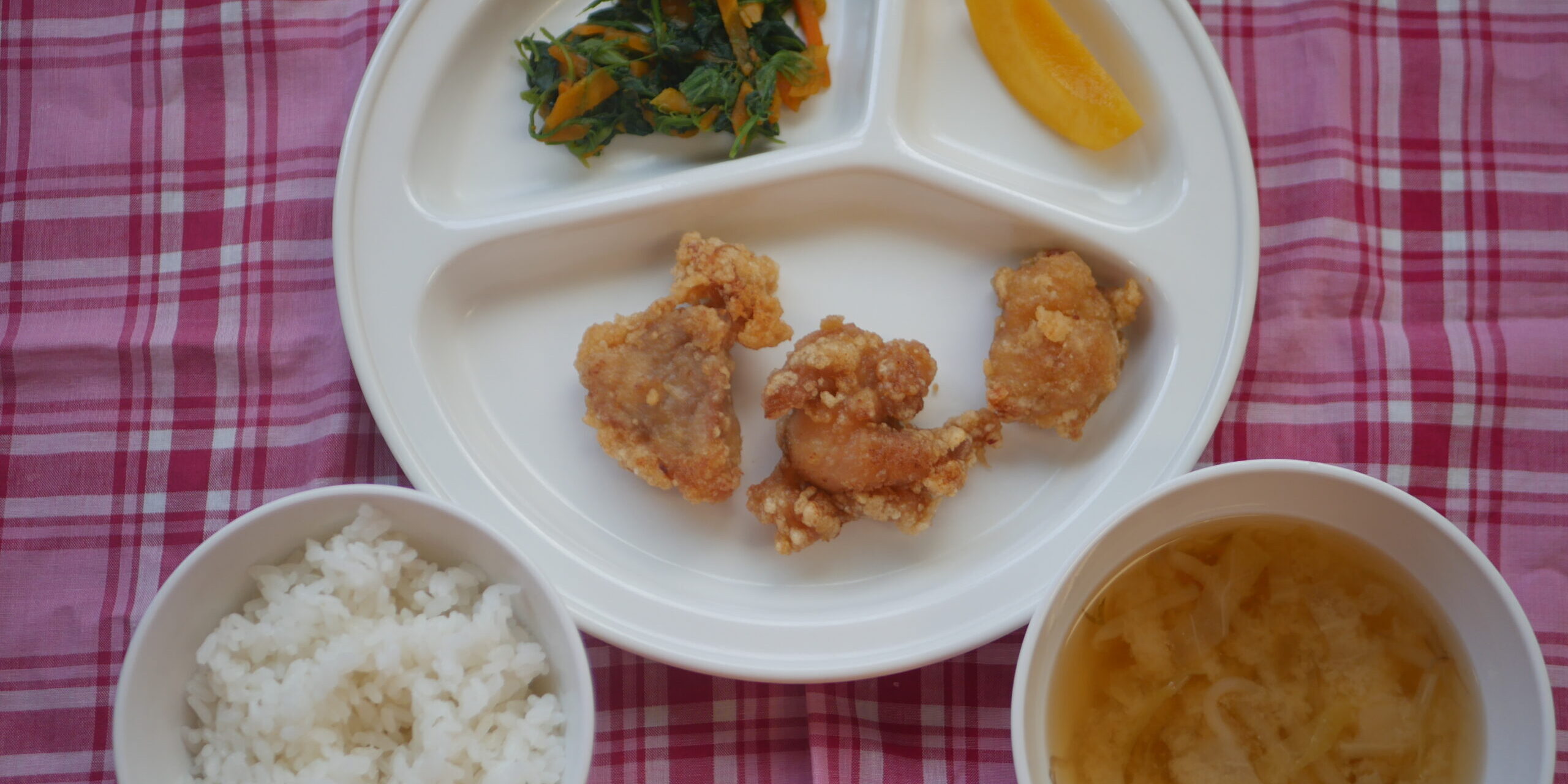 7月182025にじいろ給食ブログ~ 今日の給食 ~ ・鶏の唐揚げ ・ほうれん草と人参のおかか和え ・ごはん ・キャベツともやしのみそ汁 ・もも ~ 今日のおやつ ~ ・牛乳 ・パンケーキ Post navigationPreviousPrevious post:7月17日(木)NextNext post:7月22日(火)