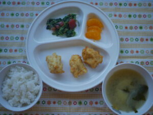 7月252025にじいろ給食ブログ~ 今日の給食 ~ ・鶏ひき肉とツナの落とし揚げ ・ほうれん草とトマトのツナサラダ ・ごはん ・じゃがいもと玉ねぎのみそ汁 ・みかん ~ 今日のおやつ ~ ・牛乳 ・とうもろこし(幼稚部・めろん組) ・とうもろこしパンケーキ(もも組・いちご組) Post navigationPreviousPrevious post:7月25日(金)NextNext post:7月28日(月)