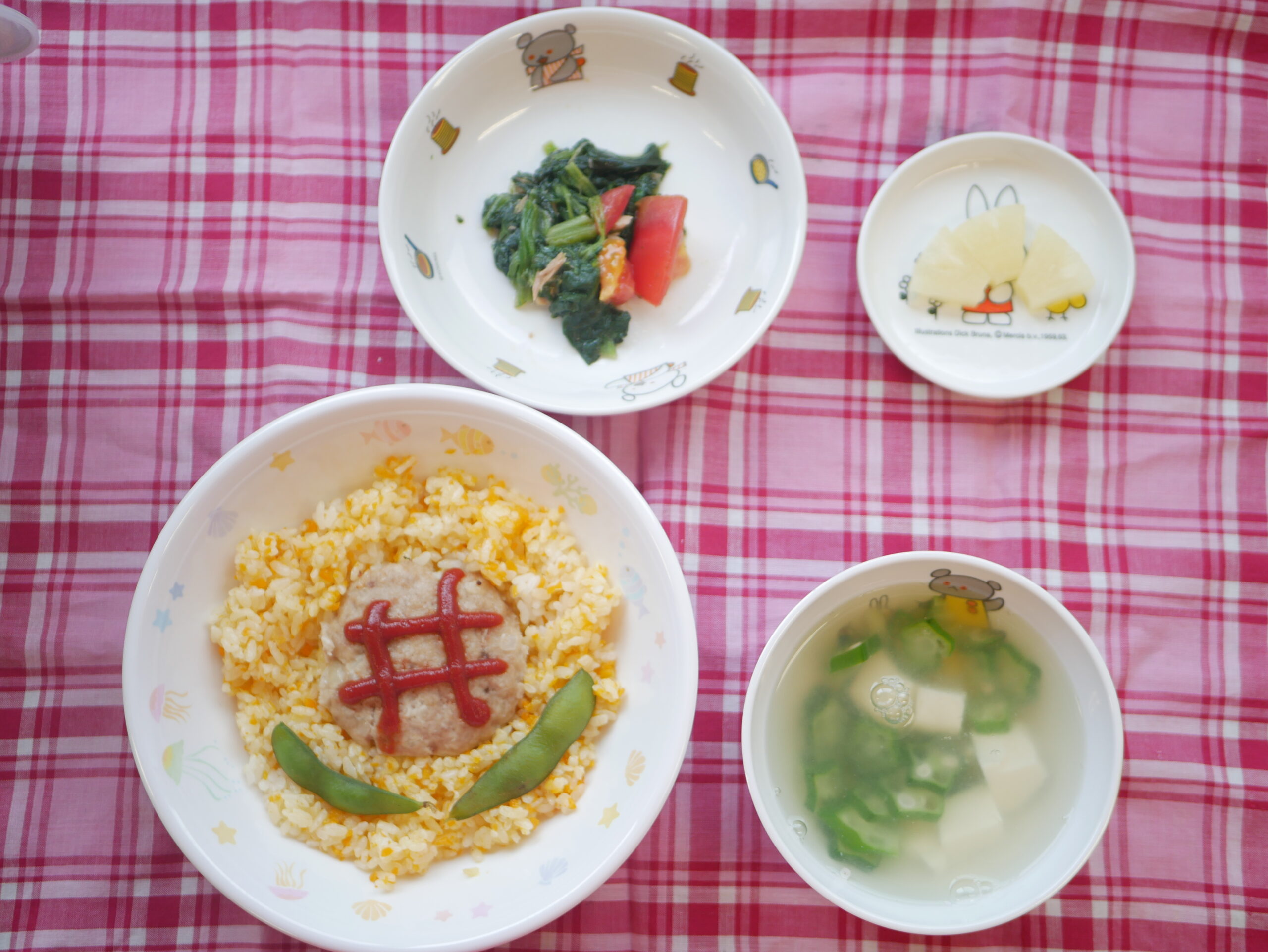 8月212025にじいろ給食ブログ~ 今日の給食 ~ ・ひまわりライス(ハンバーグ・ピラフ) ・ほうれん草とトマトのツナサラダ ・豆腐とオクラのスープ ・パイン ~ 今日のおやつ ~ ・牛乳 ・おひさまゼリー ・甘辛せんべい 今日は、「夏メニュー」でした。給食も午後おやつも見た目を楽しみながら食べていました。 Post navigationPreviousPrevious post:8月20日(水)NextNext post:8月21日(木)