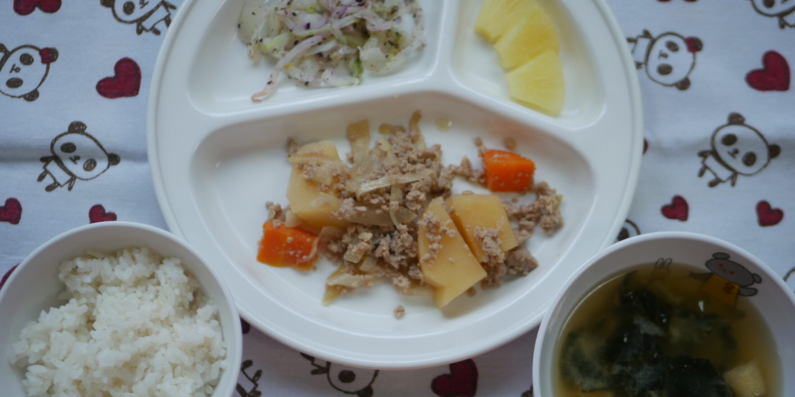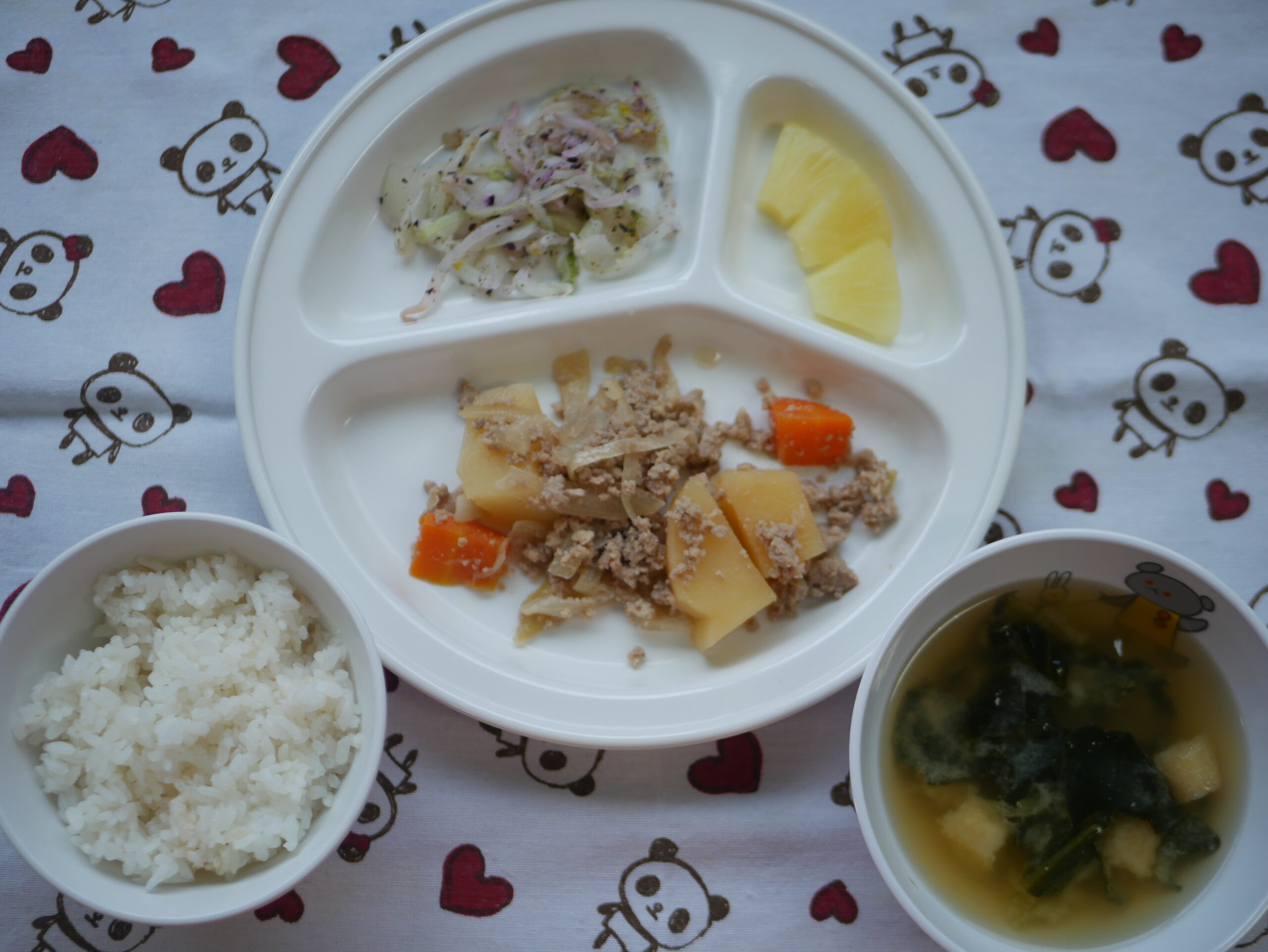 10月12025にじいろ給食ブログ~ 今日の給食 ~ ・じゃがいものそぼろ煮 ・キャベツのゆかり和え ・ごはん ・ほうれん草と油揚げのみそ汁 ・パイン ~ 今日のおやつ ~ ・牛乳 ・パンケーキ Post navigationPreviousPrevious post:9月30日(火)NextNext post:10月1日(水)