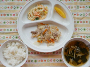 10月72025にじいろ給食ブログ~ 今日の給食 ~ ・豚肉とキャベツのみそ炒め ・スパゲティーサラダ ・ごはん ・ほうれん草とえのきのすまし汁 ・もも ~ 今日のおやつ ~ ・牛乳 ・お麩ラスク Post navigationPreviousPrevious post:10月7日(火)NextNext post:10月8日(水)