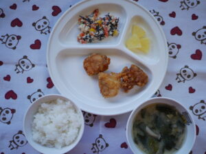 12月102025にじいろ給食ブログ~ 今日の給食 ~ ・鶏の唐揚げ ・ひじきの白和え ・ごはん ・ほうれん草としめじのみそ汁 ・パイン ~ 今日のおやつ ~ ・牛乳 ・さつまいもおやき Post navigationPreviousPrevious post:12月9日(火)NextNext post:12月10日(水)