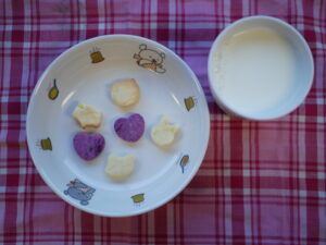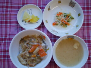 ~ 今日の給食 ~ ・中華丼 ・春雨サラダ ・大根と油揚げのみそ汁 ・パイン ~ 今日のおやつ ~ ・牛乳 ・おいもクッキー めろん組は、「おいもクッキー」作りをしました。 さつまいもは、お芋掘りで収穫した物です。 2色のさつま芋を動物やハートの形に型抜きました。 クッキングの様子は、「にじいろブログ」をご覧ください。 Post navigationPreviousPrevious post:12月12日(金)NextNext post:12月15日(月)