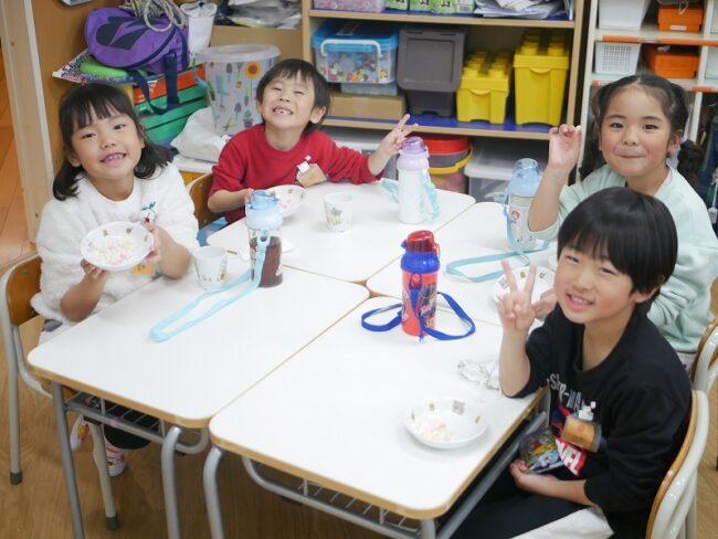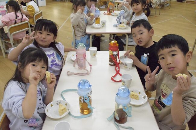 今日はバレンタインデーですね。 給食室が、ハートのココアパンケーキを作ってくれました。可愛い形に子ども達も大喜び。「先生、可愛い!」「甘くて美味しい!」と声が上がりました。
