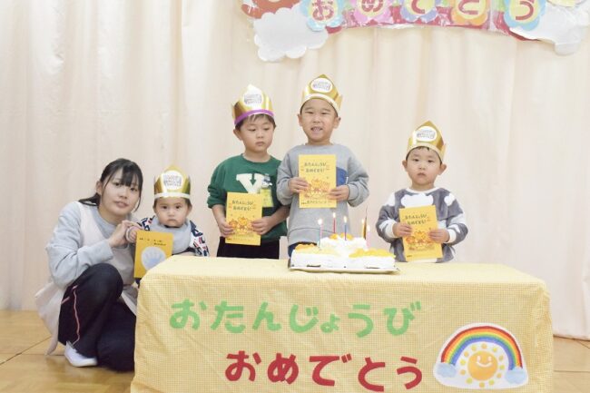 今日は2月生まれのお友達のお誕生日会をしました。大きな声でお歌のプレゼントをすることが出来ました。先生から「魔法の電子レンジ」というパネルシアターのプレゼントももらい、とても大喜びでした。