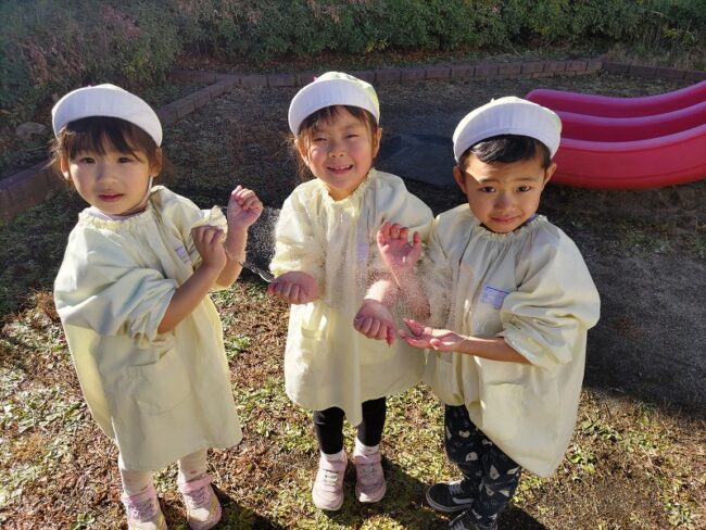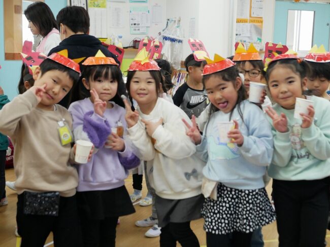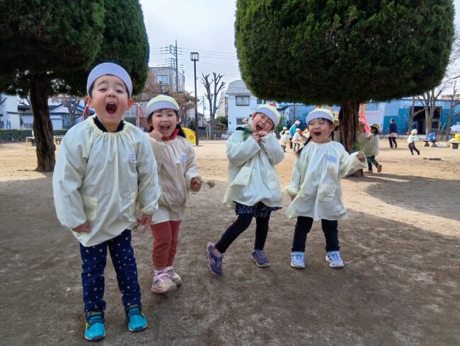 今日は保育園のみんなで豆まきをしました。鬼が来ると、怖くて泣いてしまう子もいましたが、練習した通りに「鬼は外、福は内」と言う事ができました。 みんなで力いっぱい豆を投げ、心の中の「弱虫鬼」「怒りんぼ鬼」を退治し、豆まきを…