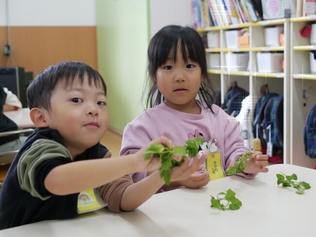 今日は「春の七草」の日です。 幼稚部では、七草のお話を聞いた後、実際に触ってみました。 春の七草は、セリ・ナズナ・ゴギョウ・ハコベラ・ホトケノザ・スズナ・ズズシロです。 「スズシロだよ」や「スズナはリンリンって神様を呼ぶ…