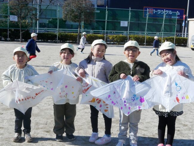 今日は、幼稚部でふれあい公園へ行き、 凧あげをしました。 自分で描いた凧を見せてくれました。 上手に凧を飛ばして喜んでいました。 また、遊びたいと言ってるお友だちが多かったです。