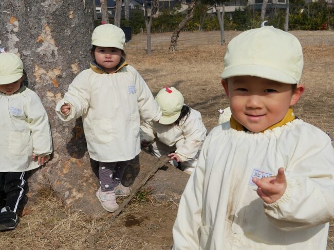 今日のいちご組の様子です。 避難訓練後に八幡コミュニティーセンターへ行きました。 木の周りを走ったり、落ちている木の皮を見つけ土を掘って遊びました。