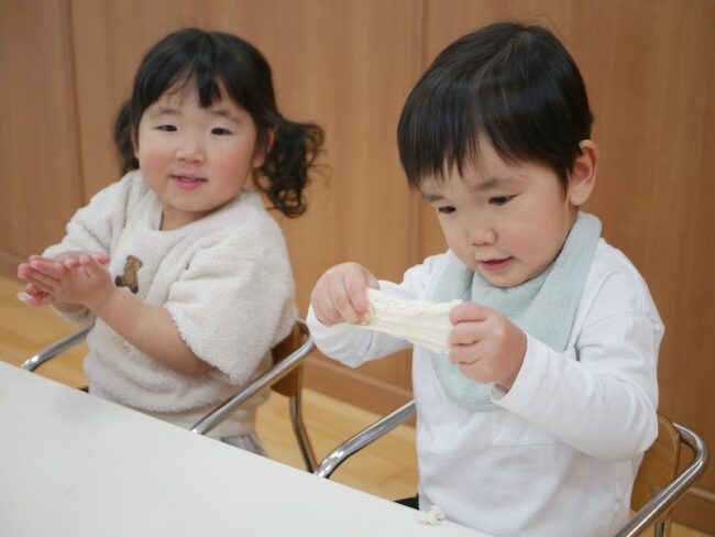 今日は、いちご組の様子です。 小麦粉粘土を使って遊びました。 保育者が小麦粉と水を加えて混ぜるなかで少しずつ小麦粉粘土になる様子も観察していました。 出来上がった小麦粉粘土を使ってとても楽しそうに自分たちで考えた物を作っ…
