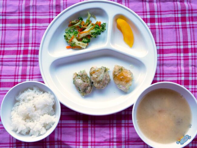 ~ 今日の給食 ~ ・鶏ひき肉と豆腐の落とし揚げ ・三色ナムル ・ごはん ・大根と油揚げのみそ汁 ・みかん ~ 今日のおやつ ~ ・牛乳 ・芋もち田楽
