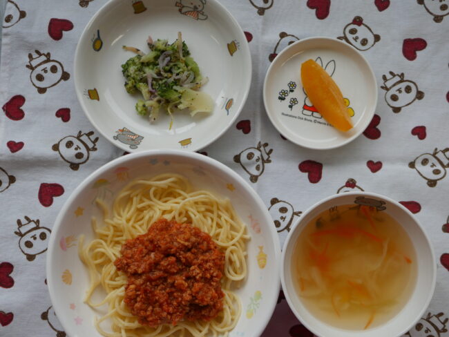 1月20日(火) にじいろ給食ブログBy にじいろ保育園2026年1月20日~ 今日の給食 ~ ・ミートソーススパゲティー ・ブロッコリーのゆかり和え ・ジュリアンスープ ・もも ~ 今日のおやつ ~ ・牛乳 ・納豆チャーハン